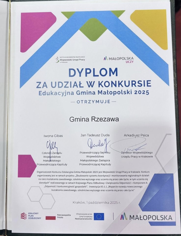 Gmina Rzezawa po raz kolejny wzięła udział w konkursie Edukacyjna Gmina Małopolski organizowanym przez Urząd Marszałkowski Województwa Małopolskiego we współpracy z Wojewódzkim Urzędem Pracy.